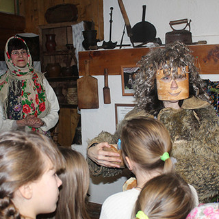 После встречи Старого Нового года гости музея оказались в святках. Директор Надежда Алексеевна Шихалёва рассказала детям о том как эти святые дни от Рождества Христова до Крещения Господня отмечались на Руси, как люди ходили колядовать. И вот ребята сами отправились колядовать. Первыми они пришли в гости в избу староверов. Тут их встретила Хозяюшка, смотрительница Елена Закурдавеа. Зазвучали веселые частушки и, конечно, посыпались загадки да вопросы. Дети должны были ответить на вопросы, например, для чего нужны предметы, стоящие у русской печи? Как они называются? Отвечающие на вопросы верно, получали сладкие призы.