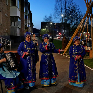 Половина вечера позади, солнце уже зашло, и чтобы согреться и взбодриться в «чайной» юрте угощают горячим чаем на травах прямо из старинных самоваров. Тут же начинается викторина со сладкими призами, дети в восторге – есть что чаем запивать. Традиционный «Таштагольский Арбат» также собрал немало желающих - художник Сергей Пальянов рисовал портреты, мастер ДПИ Сергей Заречнев - давал мастер-класс резьбы по дереву. После небольшой экскурсии по ландшафтно-этнической композиции «Хозяева Шории», где ведущая поведала о мировоззрении, культе стихийных сил и объектов природы, существовавший у шорцев, все были готовы увидеть зрелищный обряд.